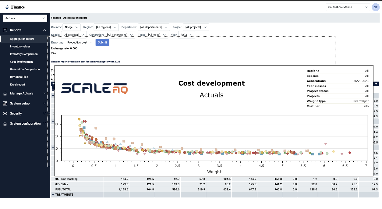 Combina datos biológicos con costos de producción para valorizar el pescado, asignar costos a través de los traslados y monitorear KPIs como costo por kilo. Soporta transferencias de stock y reportes listos para auditorías.